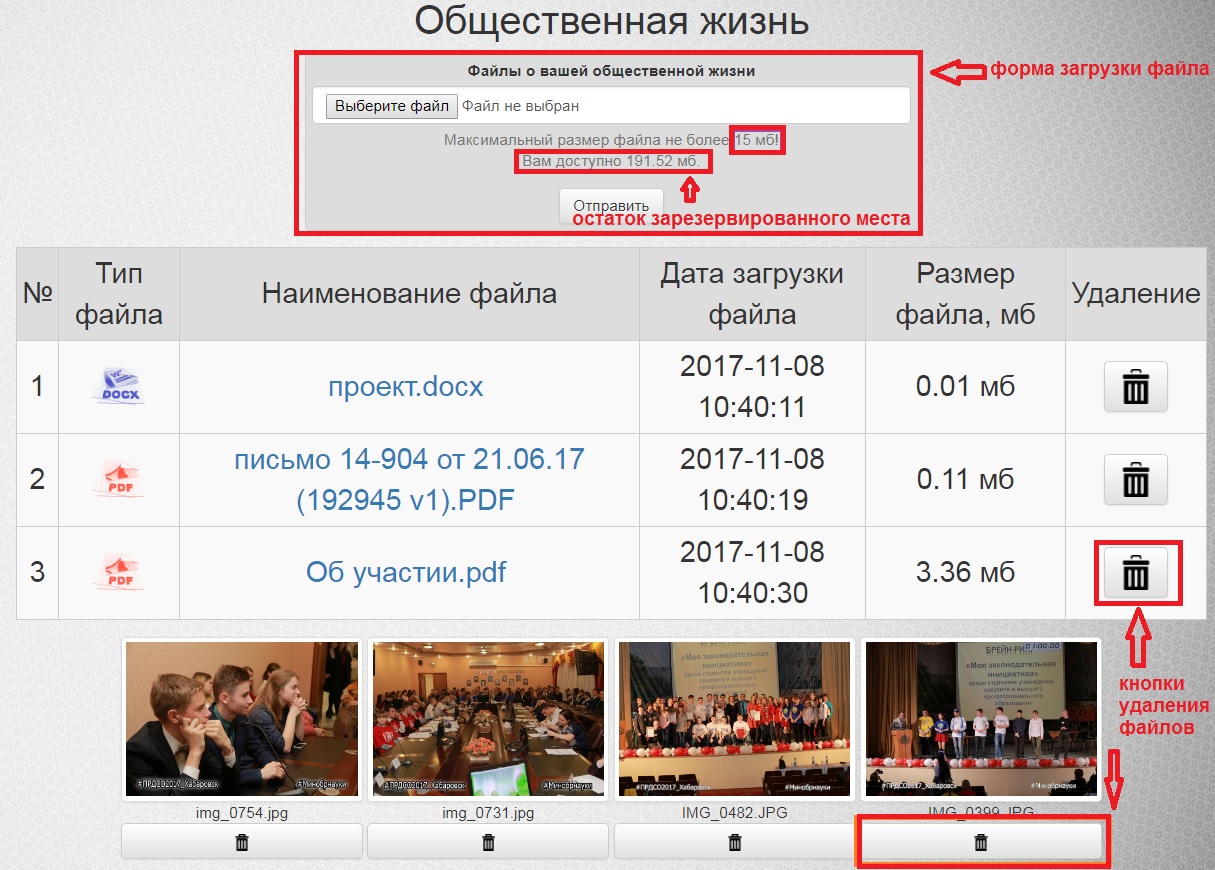 - В каждом из подразделов в которых имеется форма для загрузки файлов, вы можете загружать файлы со следующими ограничениями: